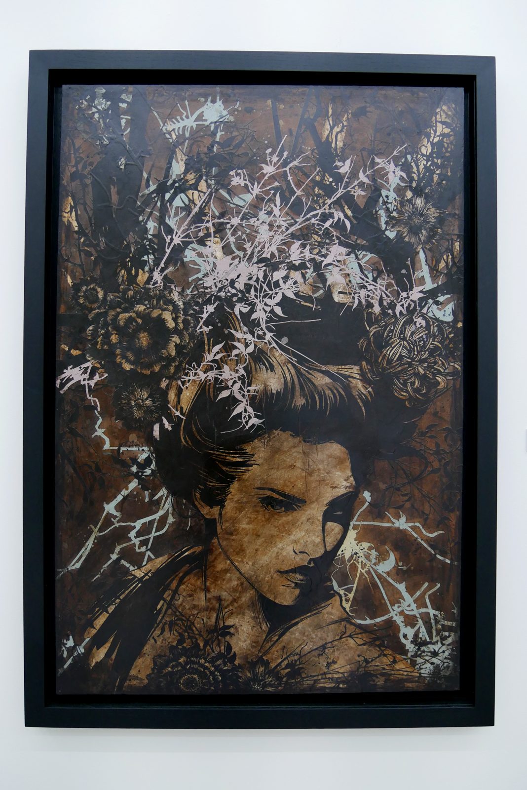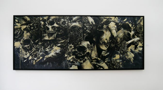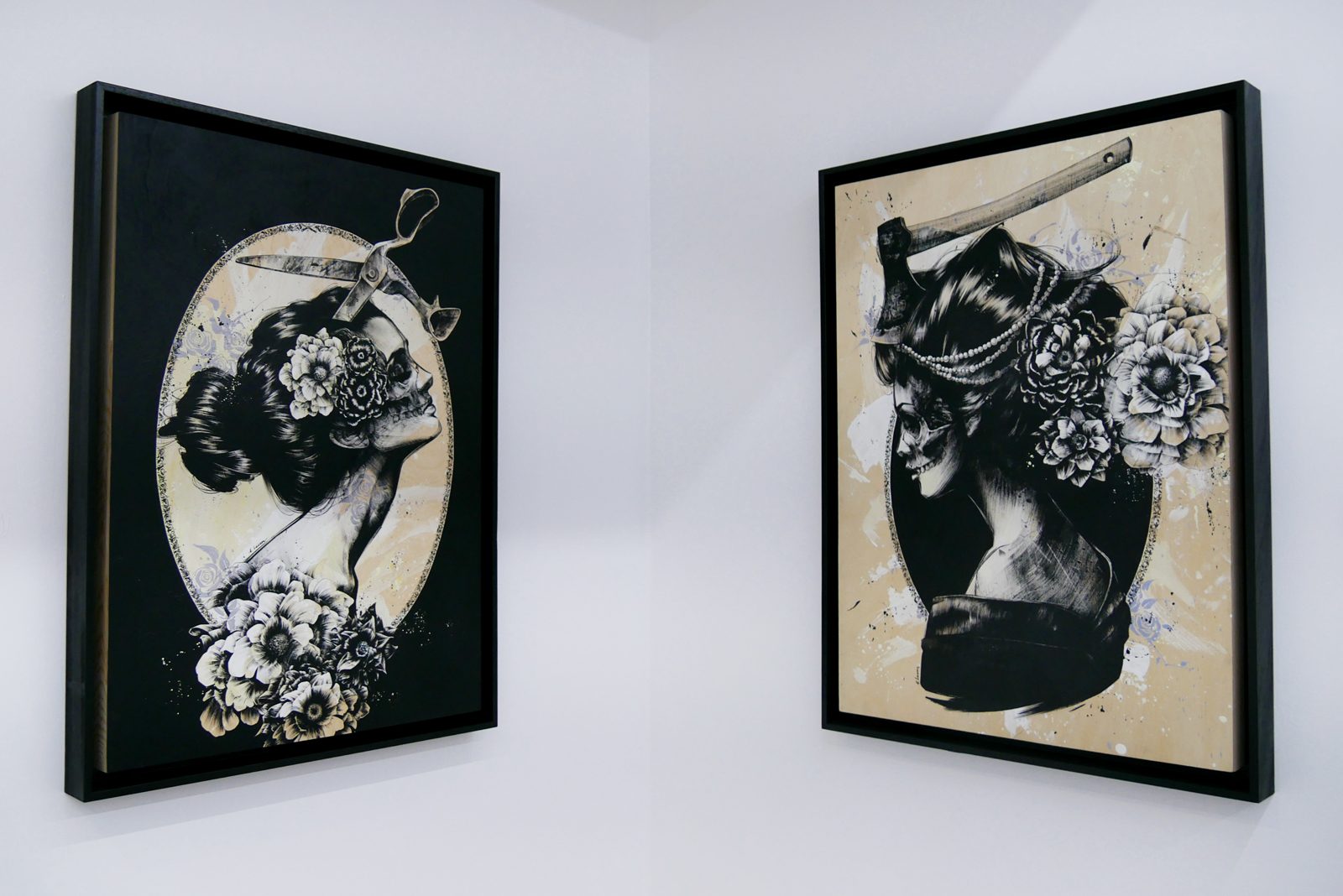 Au total, 40 oeuvres sont dévoilées dans les larges espaces de la galerie sur différents médiums : faux cranes, toiles, assemblages de papiers peints coupés à la main. On peut retrouver les thèmes chers à l’artiste comme : rat, crâne, femme, robe, notamment dans cette toile immense qui accueille les visiteurs et qui a nécessité quasiment une année de travail.