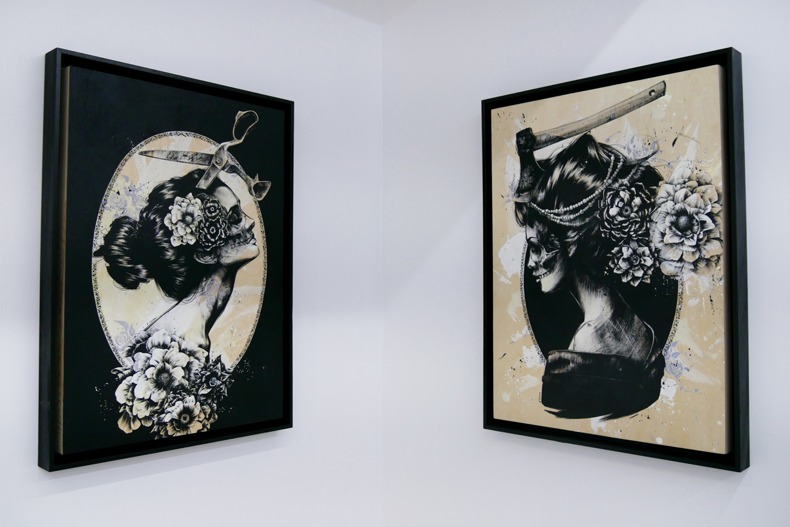Le jeune homme est dessinateur, directeur artistique et donc street-artiste. Il se frotte aussi bien au graphisme, à la mode, qu’au tatouage et à la sculpture. La Galerie Pari(s) Urbain présente actuellement une large sélection d’oeuvres : dessins, sculptures sur bois, huiles sur toile et sérigraphies. Toutes les techniques sont maitrisées et méritent une visite.