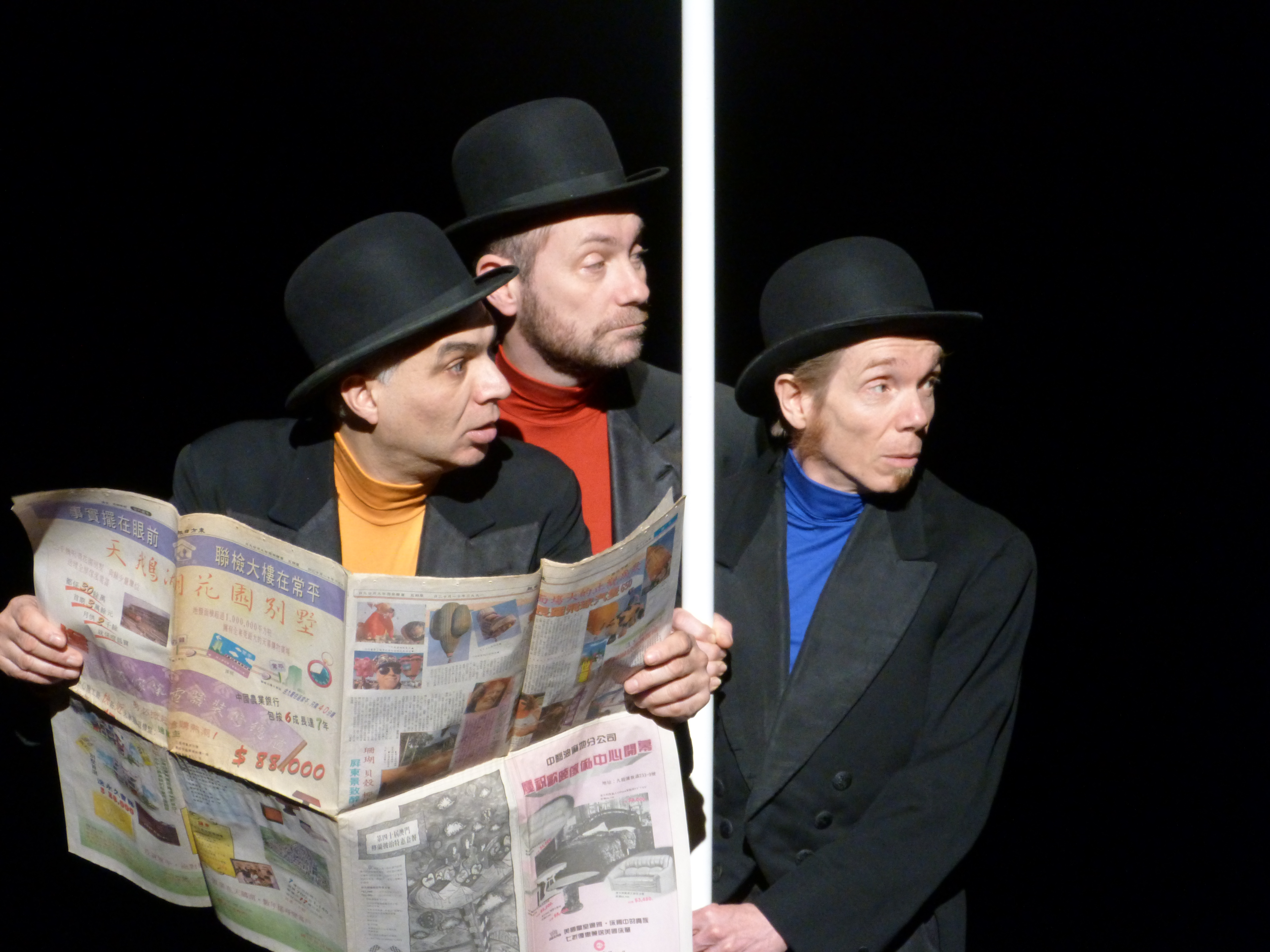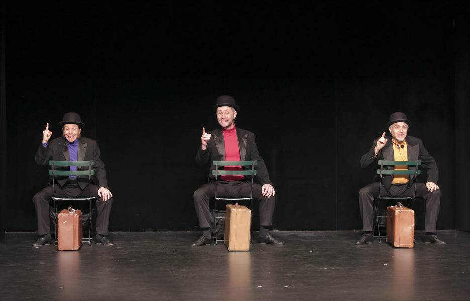 L’adaptation théâtrale semblait difficile mais elle est exécutée ici avec brio. Le décor simple, minimal centre tout sur le jeu d’acteur : trois pantins articulés qui, tour à tour ou ensemble, parlent, chantent, miment, pastichent ou parodient en se complétant mutuellement avec une répartie sans égale. Respect !