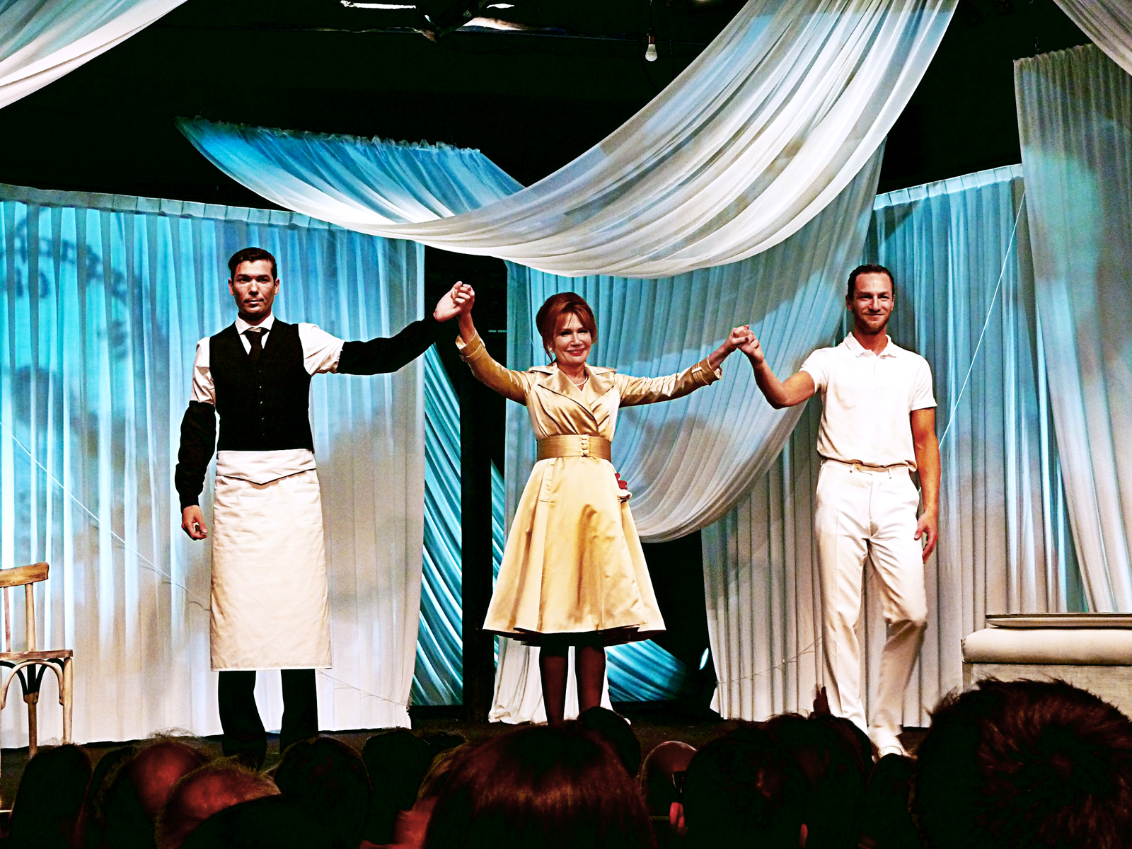 Aux côtés de la comédienne, deux hommes silencieux jouent à la fois l’amant ténébreux et l’intendant d’hôtel et de bar. Le décor fait de voilages aurait pu paraître un brin kitsch, mais finalement offre le cadre vaporeux idéal pour cette parenthèse passionnée dans la vie d’une femme.