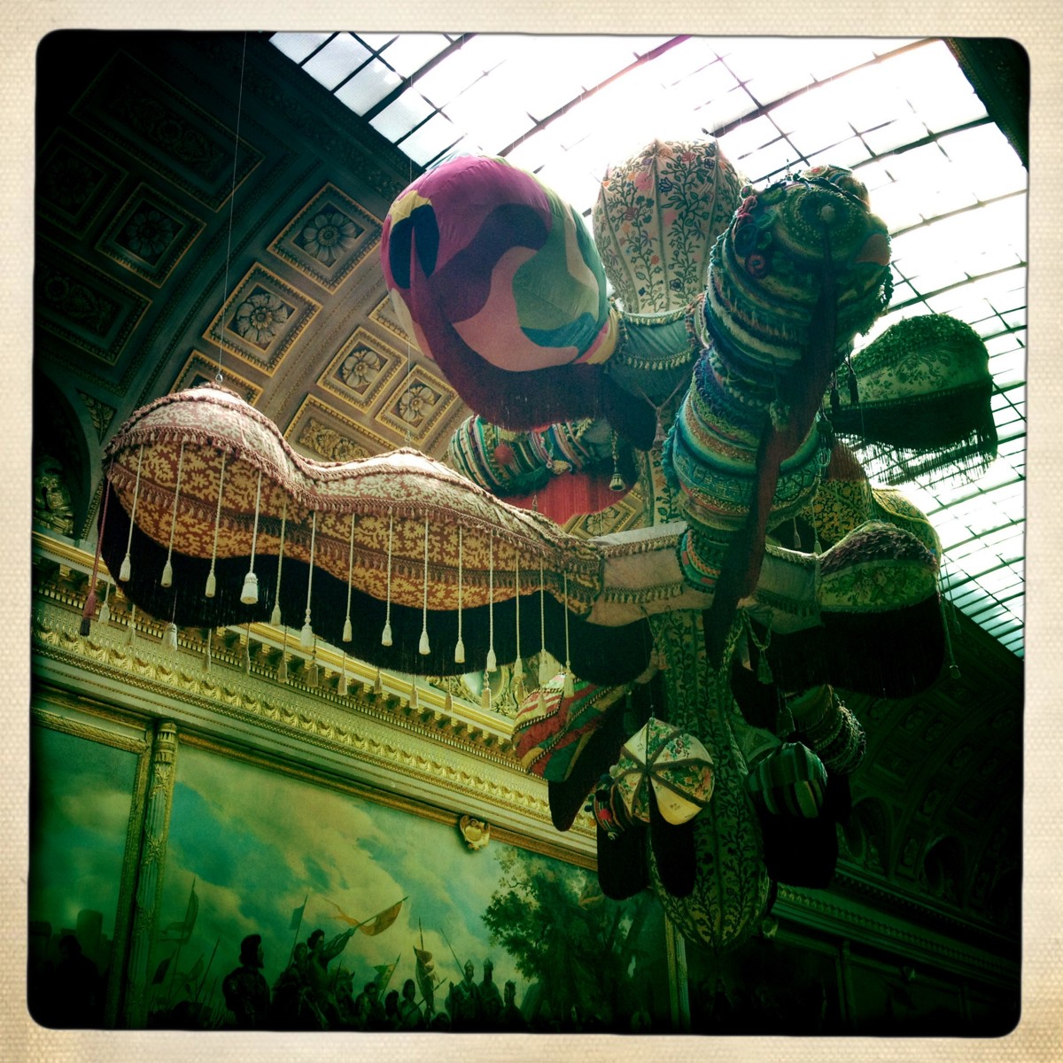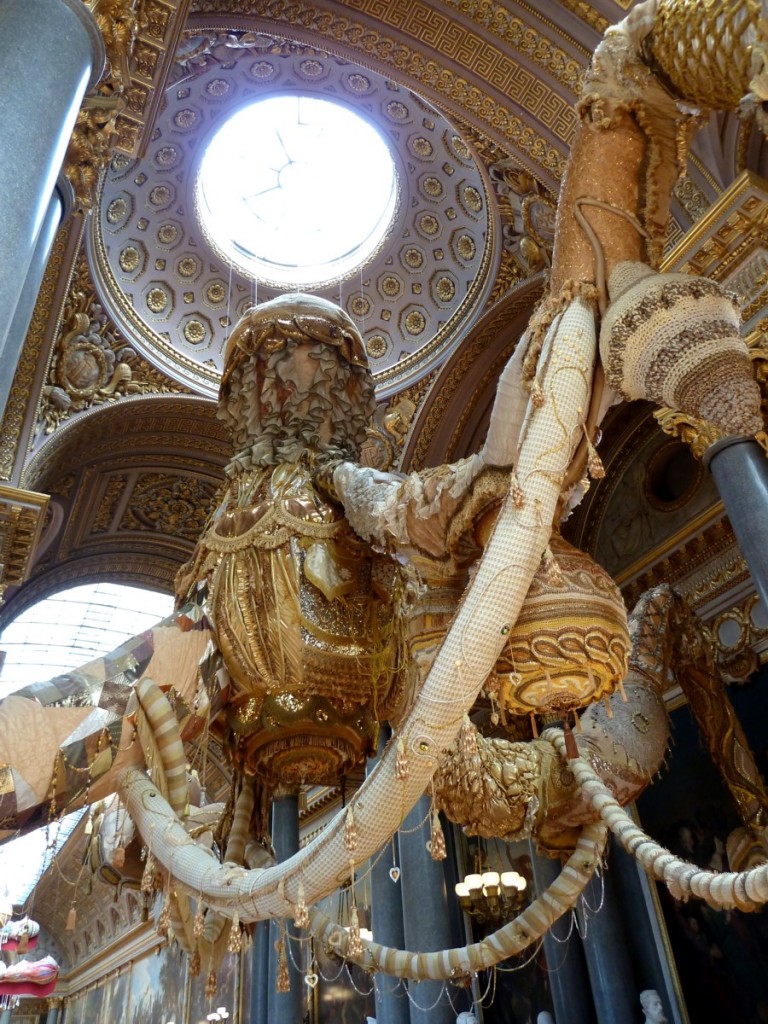 Jeux de suspensions dans les salles où trois œuvres monumentales faites de tissus se succèdent. La lumière de la verrière au-dessus irradie les prises de vue. Le jeu de volumes, de couleurs rappellerait des tentures d’apparat, des textures d’un autre siècle, celui de Louis XIV.