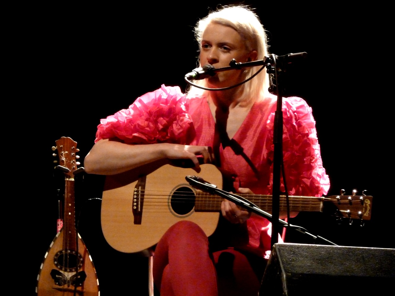 Cependant, sa blondeur nous trouble tout au long du show. Cachée par ses instruments et le pied de son micro, on croit deviner des traits communs avec l’actrice américaine Uma Thurman, alors que la couverture de l’album lui découvre une ressemblance avec Tilda Swinton.