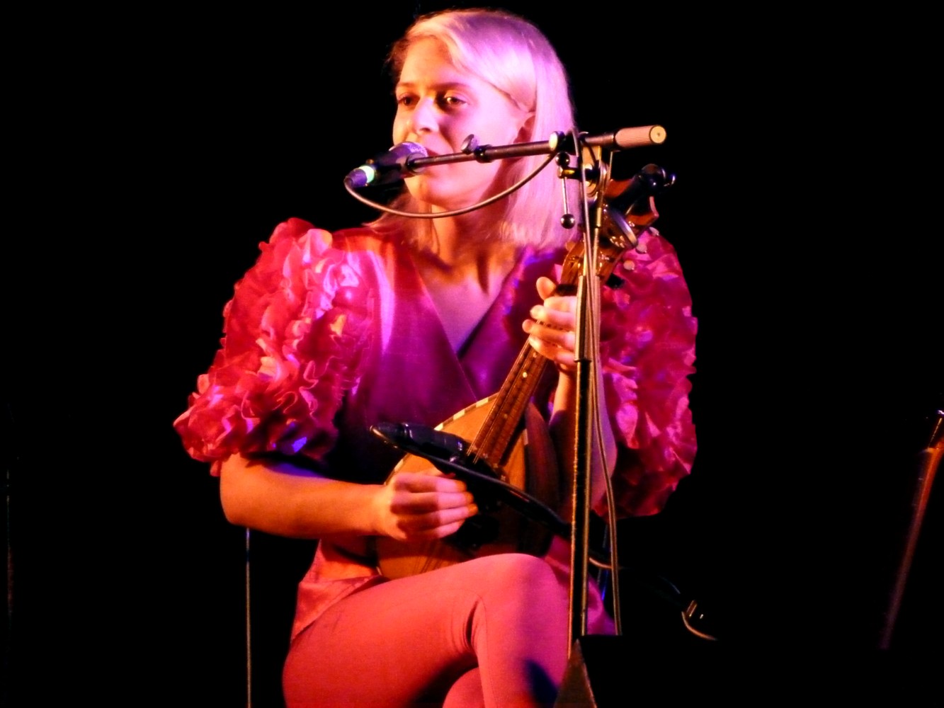 La distance visuelle s’altère enfin quand l’artiste se lève pour un conte norvégien. Seule, a cappella. Première initiation à la musicalité du norvégien. Dépaysant.