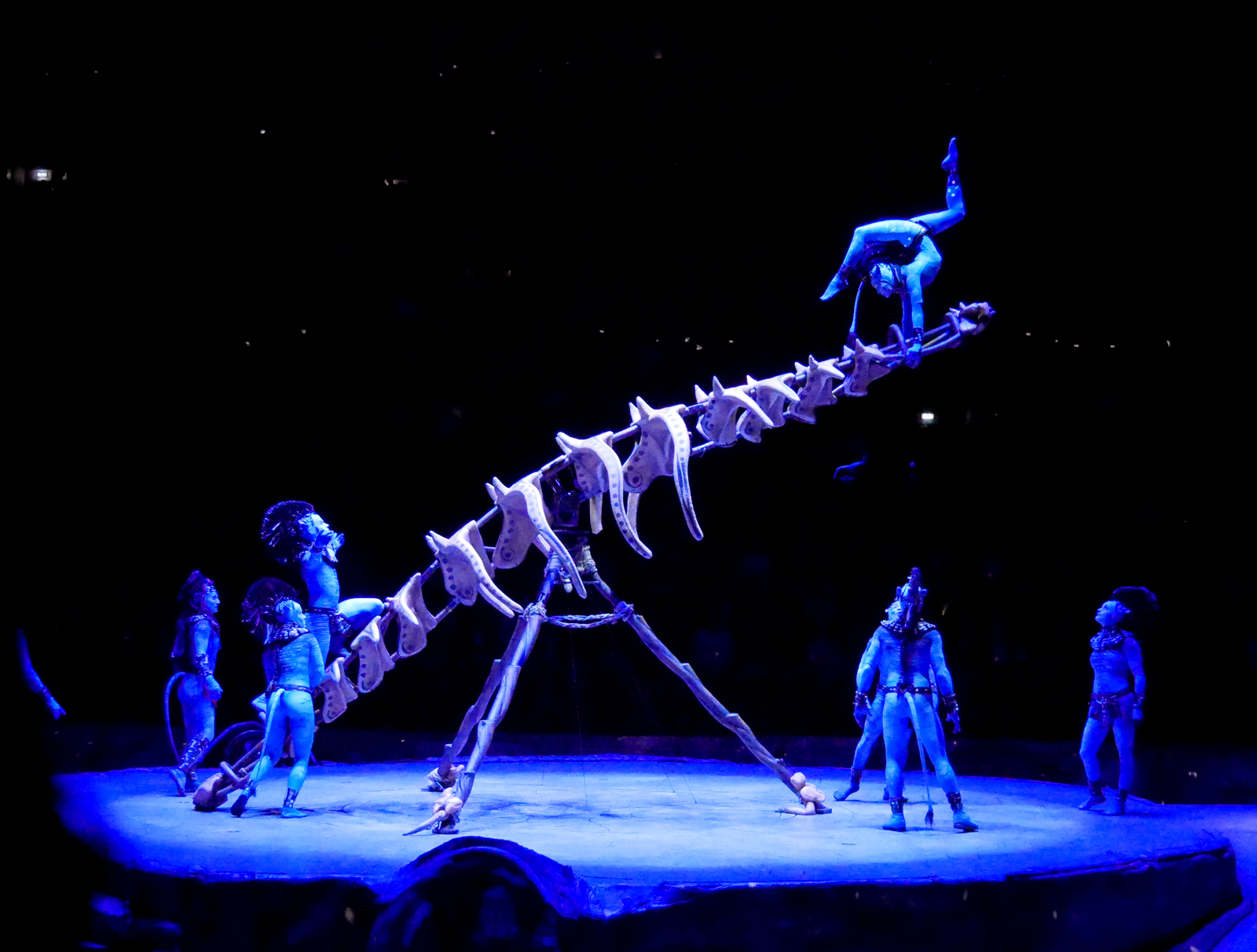 Cette fois, ce ne sont pas les numéros qui donnent leur sens au spectacle mais le récit. On se trouve téléportés 3 000 ans avant Avatar pour suivre l’aventure de deux garçons Na’vis, Ralu et Entu, bientôt rejoints par la jeune fille Tsyal, lancés dans une course pour sauver leur arbre de vie.