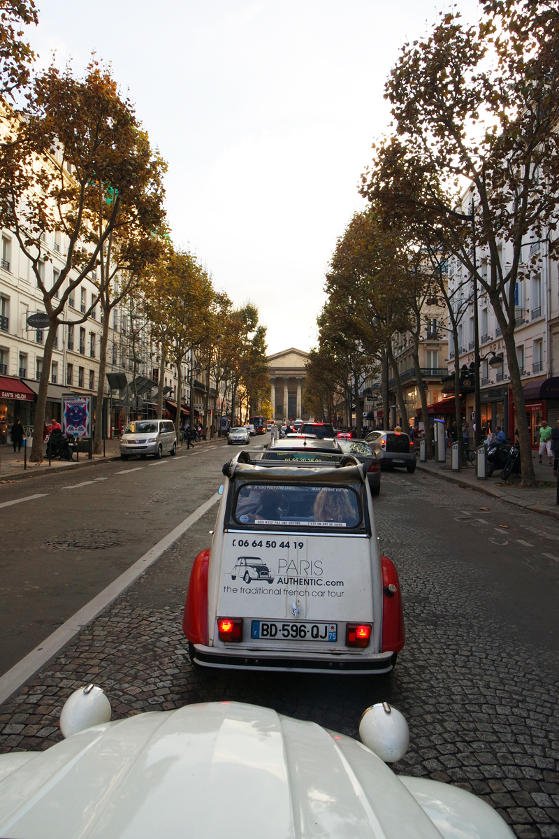 Nouvelle monture pour traverser les Grands Boulevards : la 2CV de Paris Authentic. Rustique, sonore, tape-cul, cette voiture-là a vécu et n’a pas été effrayée par le passage au XXIe siècle. Elle nous assure une virée décalée et inoubliable, redécouvrant la Madeleine et tant d’autres monuments.