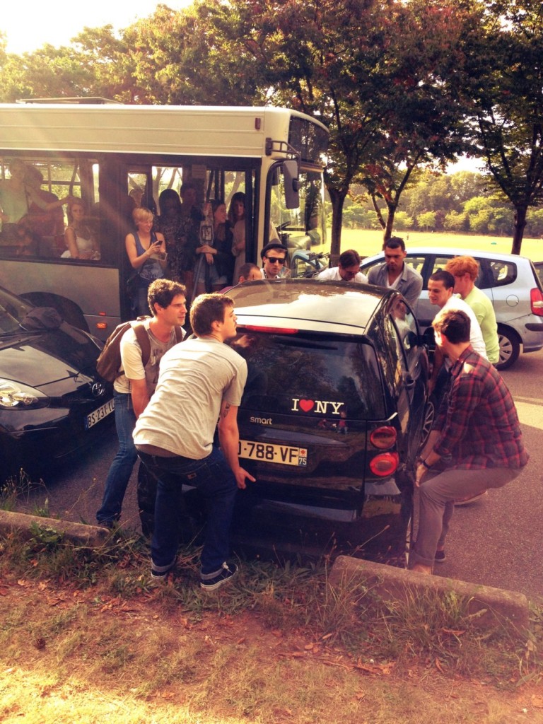 Première séquence à sensation avec la tentative de soulèvement d’une Smart mal garée, bloquant une navette We Love Green bondée.