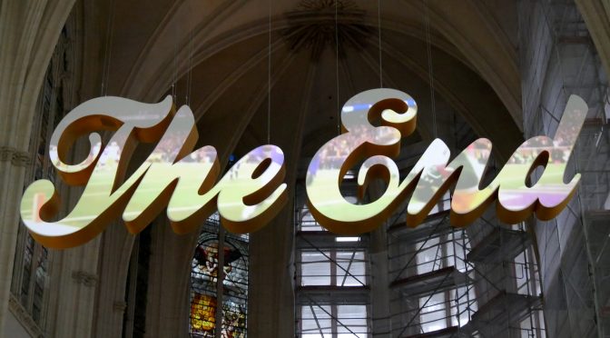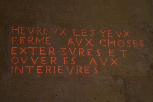 L’autre touche exotique se trouve dans le dispositif lumineux mis en place tout autour du chemin de ronde du bâtiment principal : In girum… (imnus nocte et consuminir igni). Visible de nuit, il doit rappeler à chacun(e) que le lieu est investi d’une présence inhabituelle.
